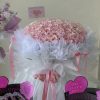 It contains eustomas, roses, ping pong, anthurium and small flowers.