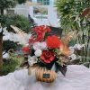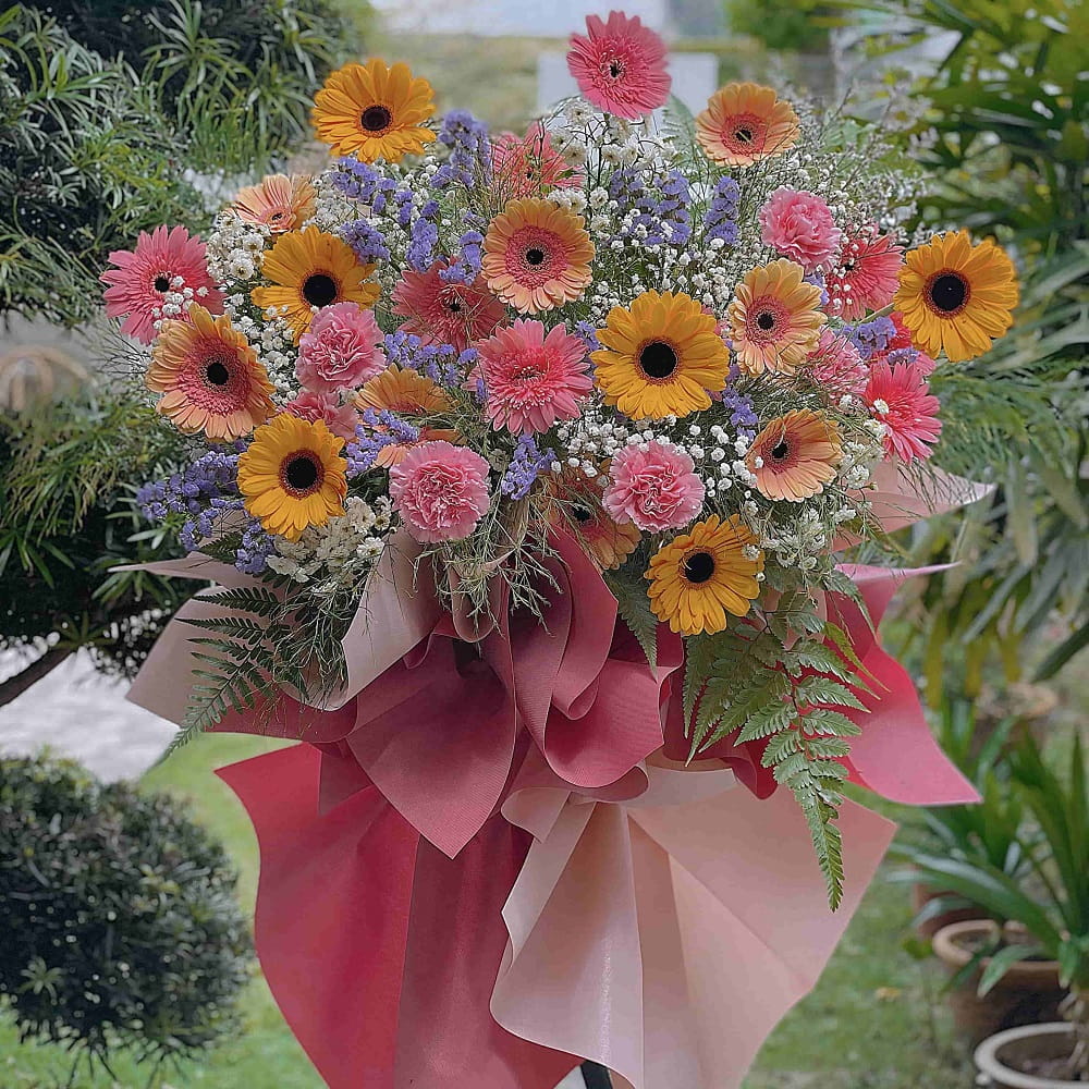 It contains 22-25 stalks of gerbera, 6 stalks of carnation, baby’s breath, fillers and leaves.