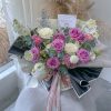 It contains roses, tulips, spray carnation, small flowers, fillers and eucalyptus leaves.
