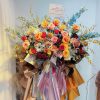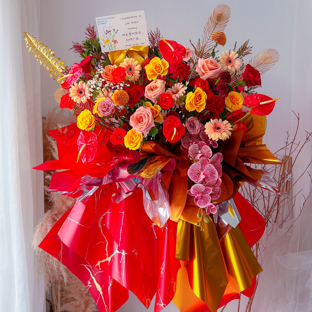 It contains roses, gerbera, ping pong flowers, baby’s breath, small flowers, orchid, fillers and leaves.