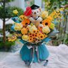It contains pingpong flowers, sunflower, roses, chamomile, small flowers, fillers and leaves.